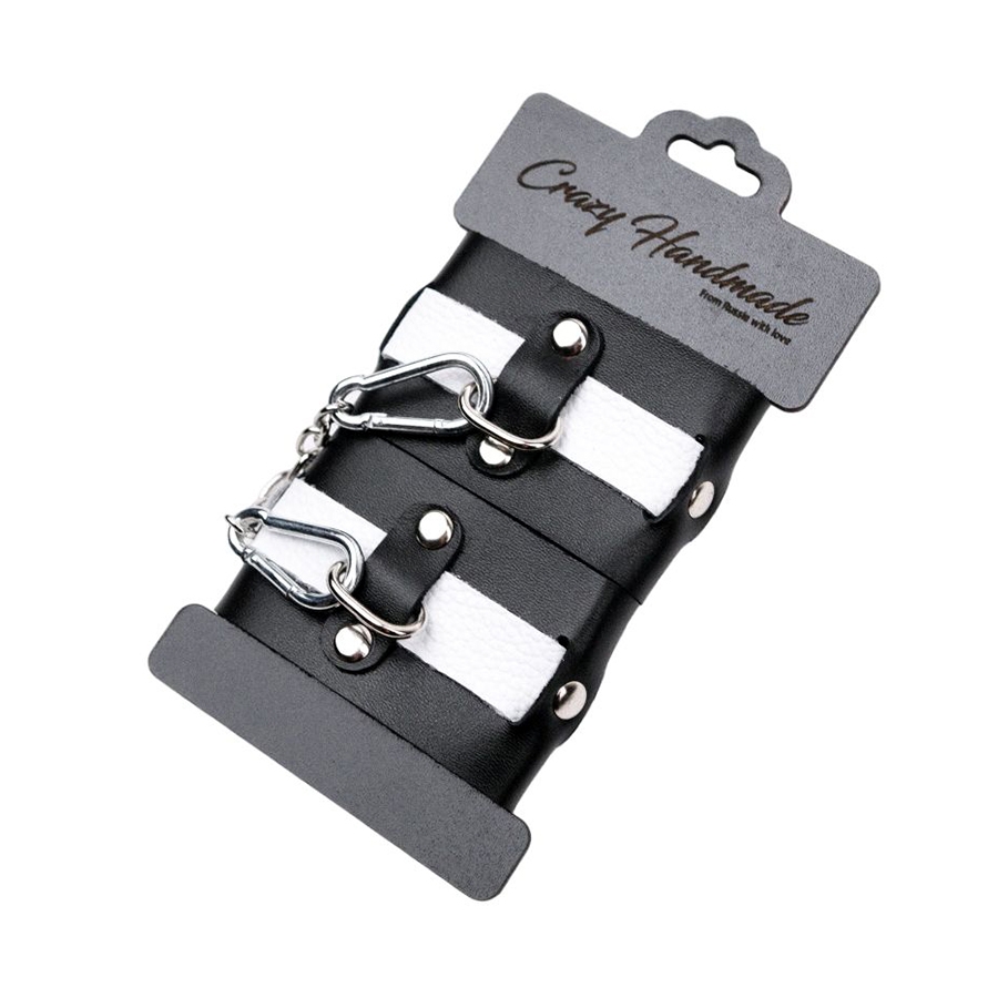 Наручников включает в себя две детали - основу в форме прямоугольника, изготовленную из черной натуральной кожи, и белый ремешок с прочной хромированной фурнитурой в виде овального кольца. Расположение ремешка через прорези в основной части является не только декоративным решением, но и позволяет лучше регулировать размер. В комплект также входит соединительная цепочка с двумя карабинами.